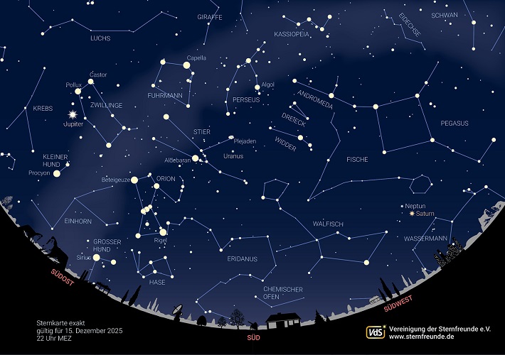 Jupiter in den Zwillingen strebt auf seine Oppositionsstellung zu, die er aber erst am 10. Januar 2026 erreichen wird. Trotzdem ist der größte Planet des Sonnensystems im Dezember optimal zu beobachten. Am 7.12. wandert der abnehmende Mond an Jupiter vorbei.